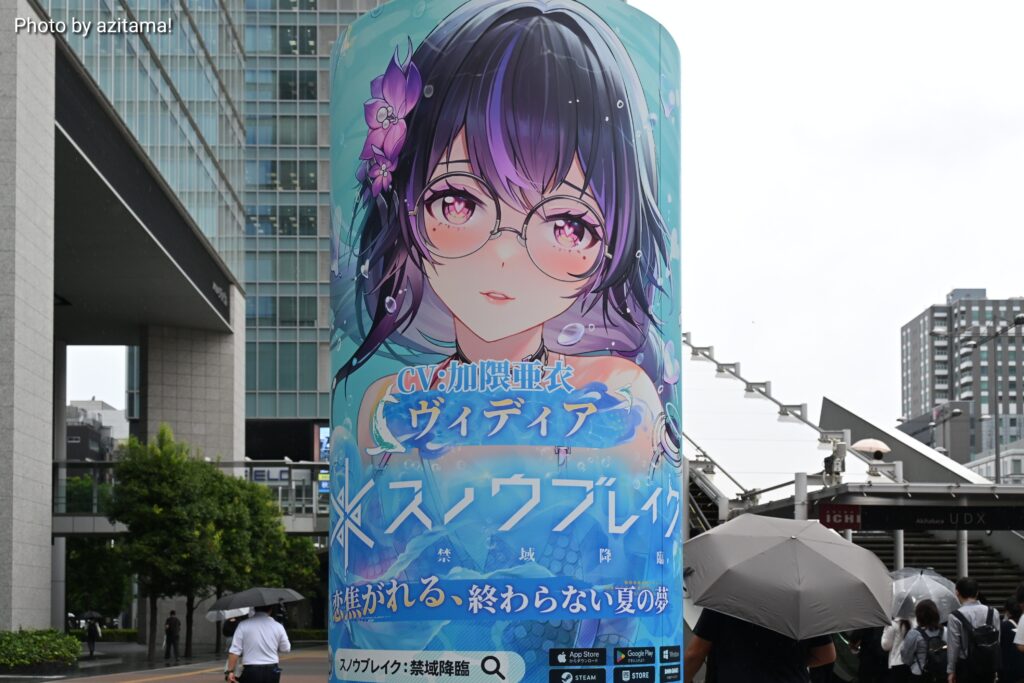 今回はゲーム『スノウブレイク : 禁域降臨』で、広告ではかなり規制が施されているものの、水着衣装の主要キャラクターたちが登場。10月(厳密には9月末)からの掲載だが、夏らしい雰囲気のある広告となっている。