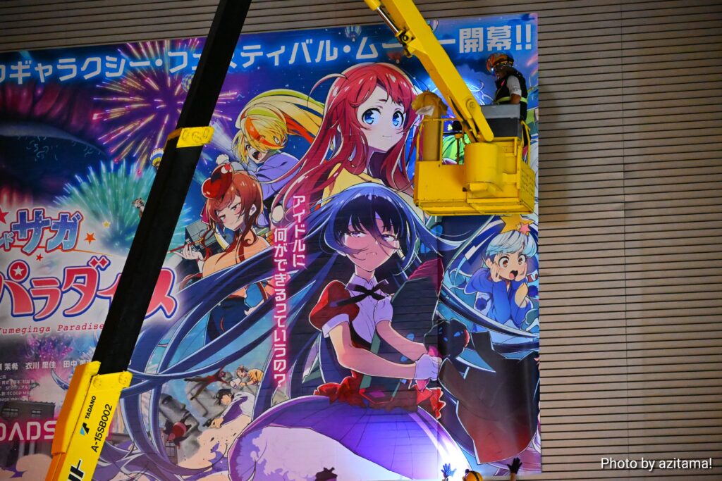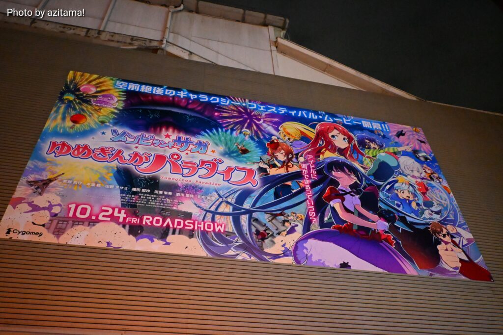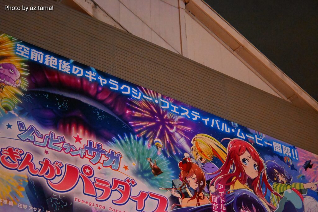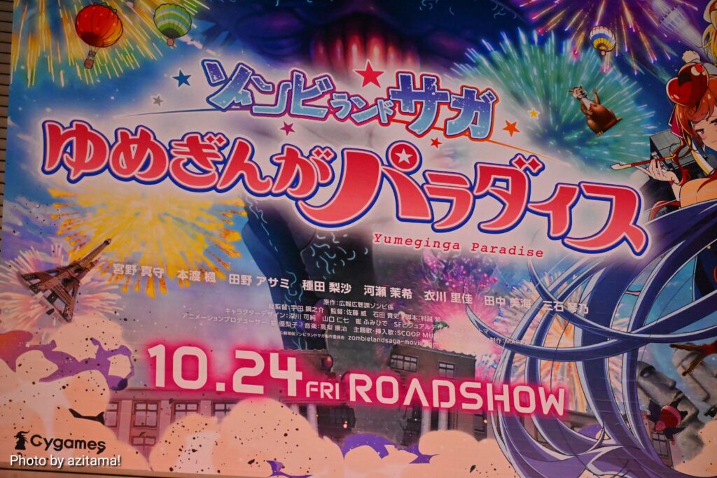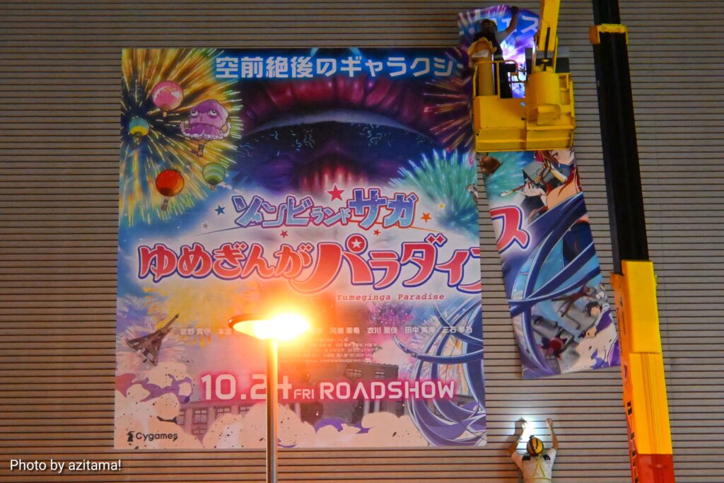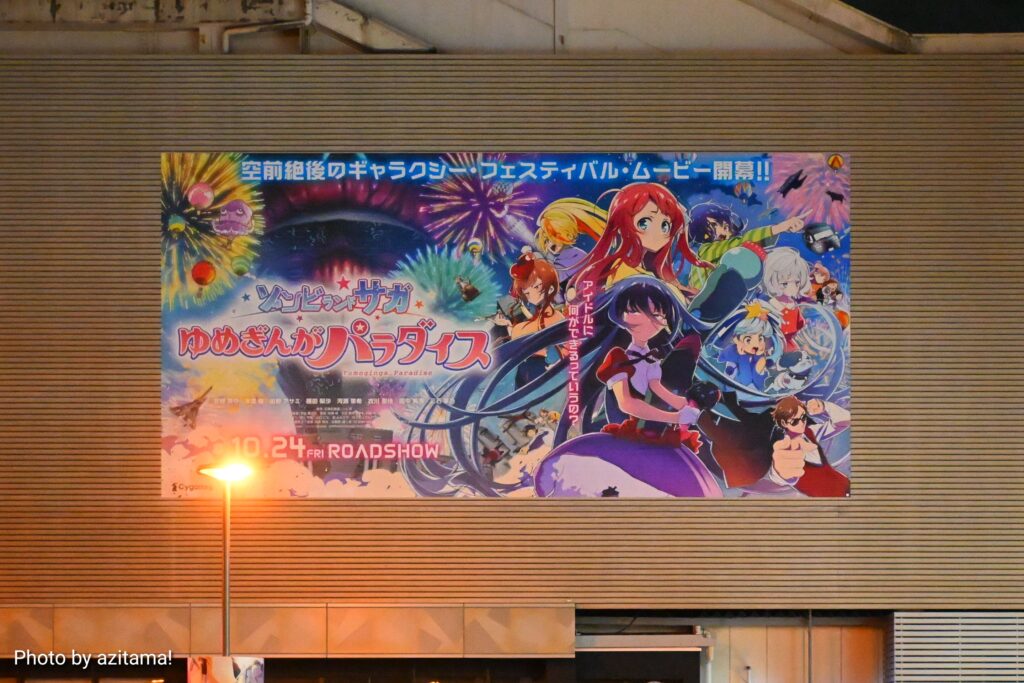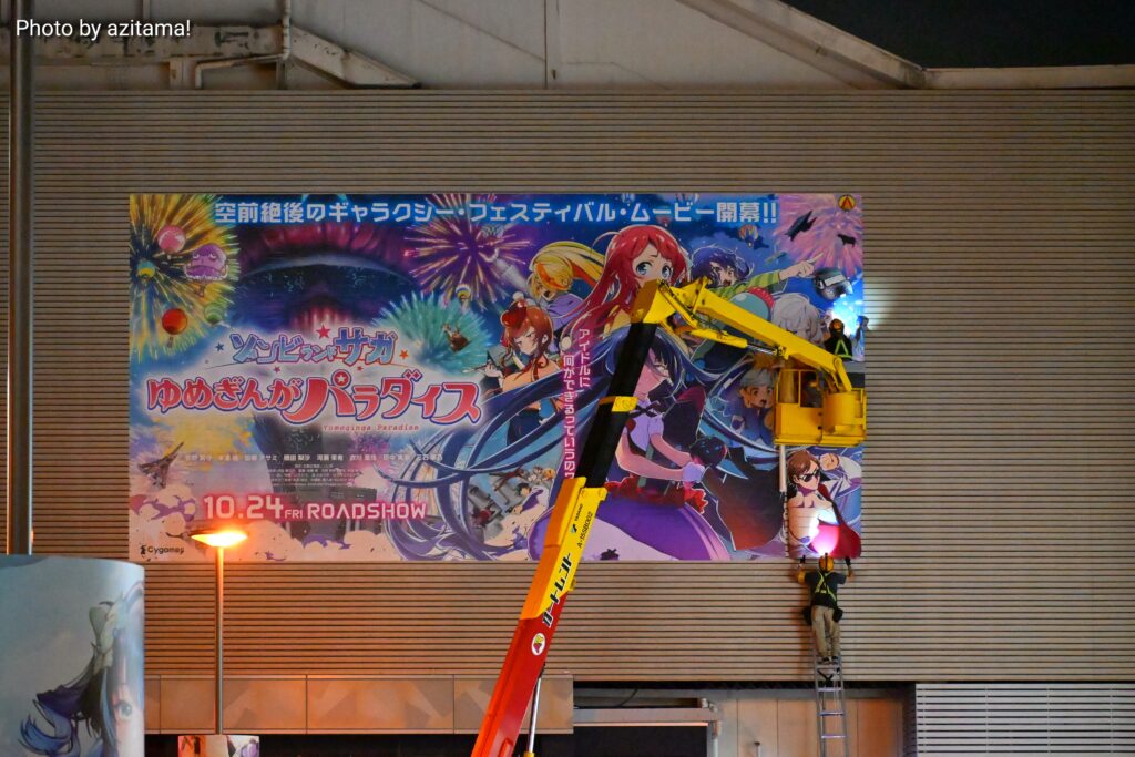 今回の広告は劇場版『ゾンビランドサガ ゆめぎんがパラダイス』で、2025年10月24日に公開される映画作品。広告ではキャッチコピー「空前絶後のギャラクシー・フェスティバル・ムービー開幕!!」の文字とともに「10.14 FRI ROADSHOW」と、上映日の告知もされていた。