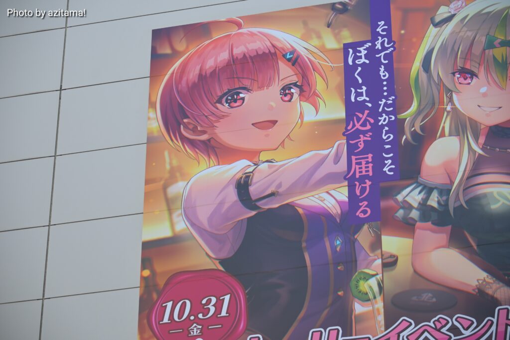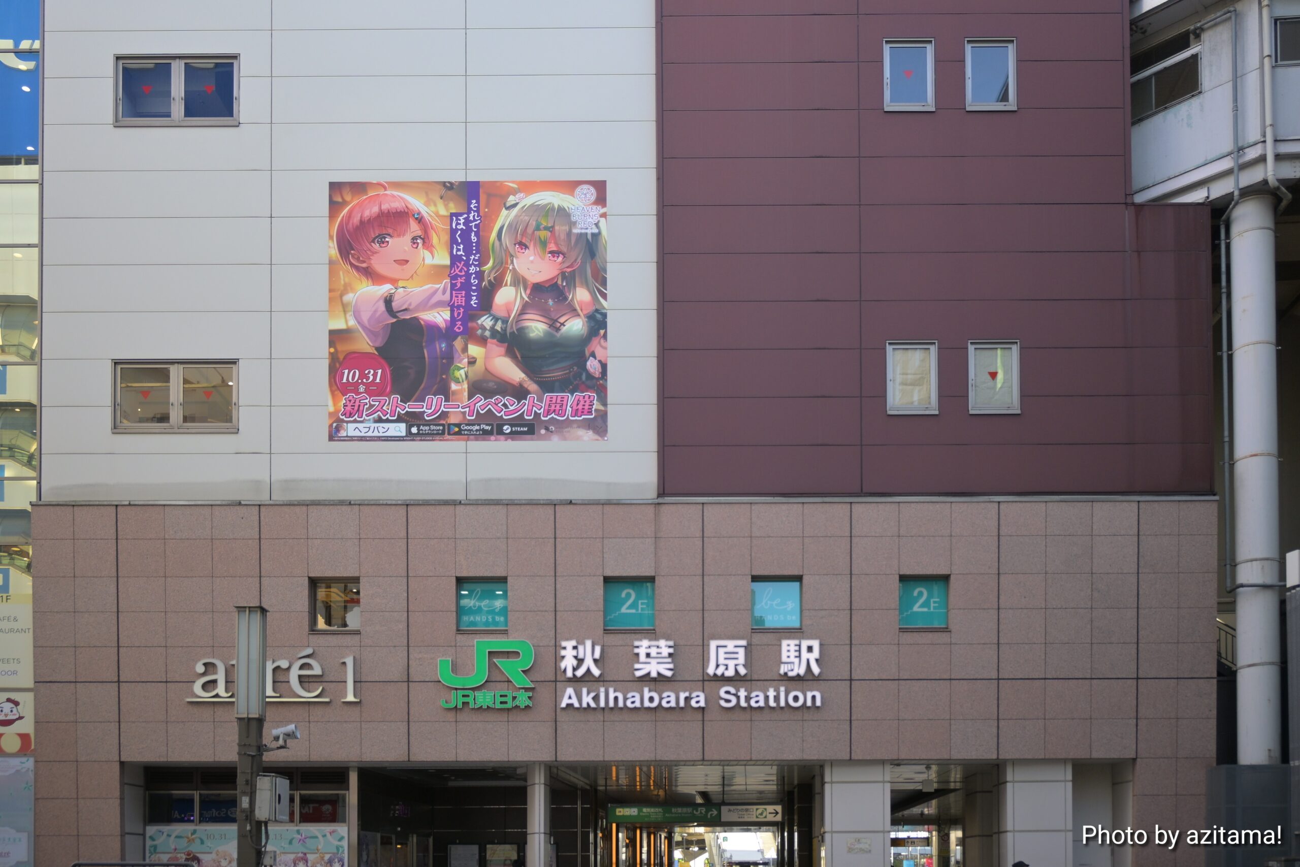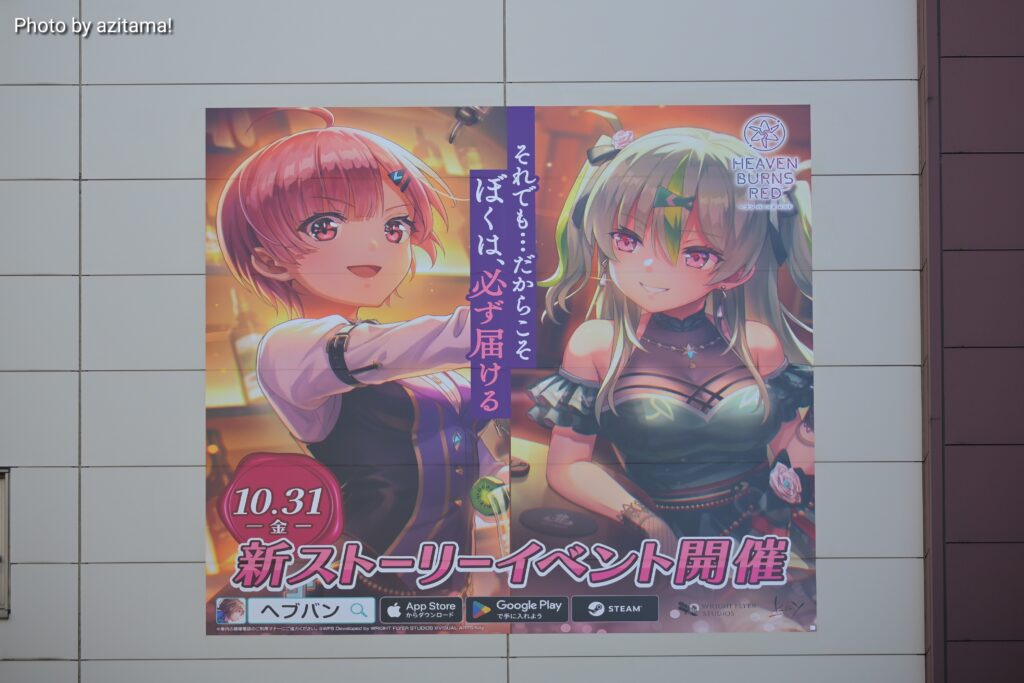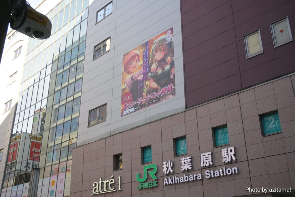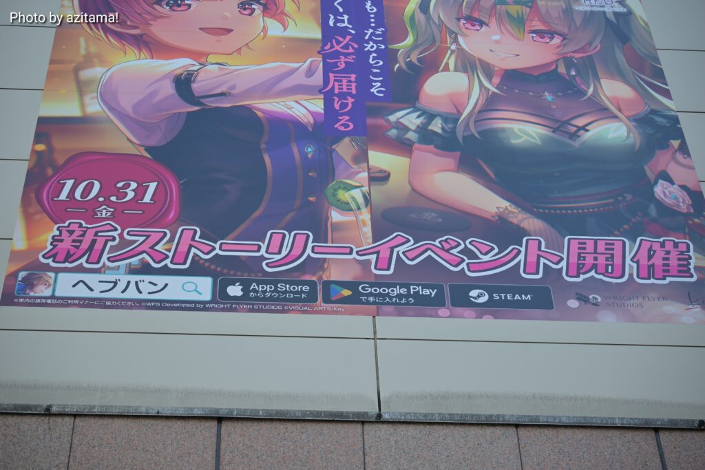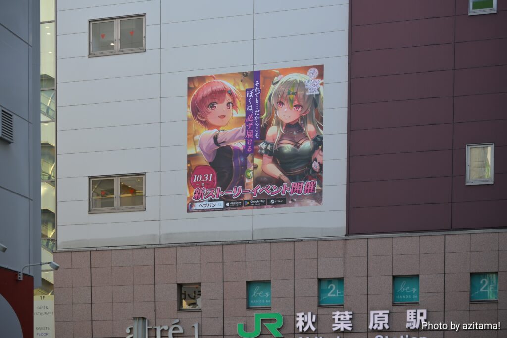 JR秋葉原駅の電気街南口、秋葉原電気街口サウスシートの『ヘブバン』広告が更新されて、「10.31(金)新ストーリーイベント開催」大島三野里、大島五十鈴の広告が掲載されている。