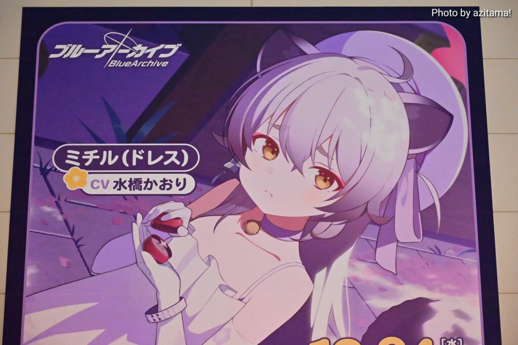 今回は『ブルアカ』ミチル(ドレス)ツクヨ(ドレス)の広告で、広告の左側ではミチル(ドレス)のメモリアルロビーが単独で登場。この場所での『ブルアカ』新規広告は今年の9月、『誰が為の芸術~偽飾の絵画と美学の行方~』以来となった。