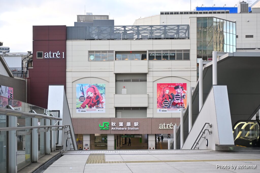 JR秋葉原駅の電気街北口、アトレ秋葉原の上部に広告が掲載。交通広場や歩道橋など、様々な場所から広告が見える。