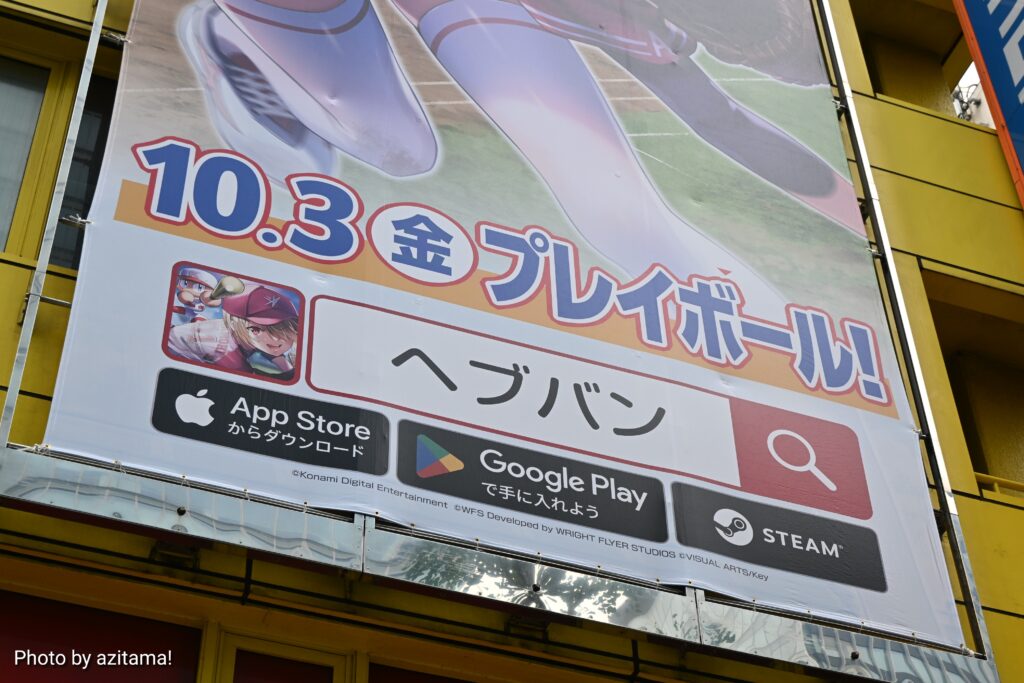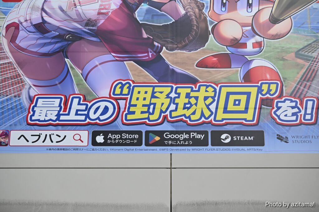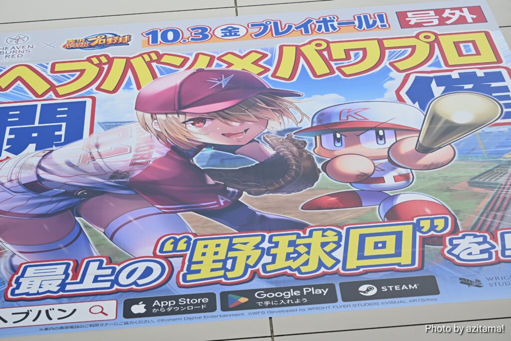 今回はヘブンバーンズレッド × 実況パワフルプロ野球で、10月3日よりコラボイベントが開催されることを告知した広告。JR秋葉原駅では広告右上には「号外」の文字もあり、ムーランの広告以上にスポーツ新聞を意識したようなデザインとなっていた。