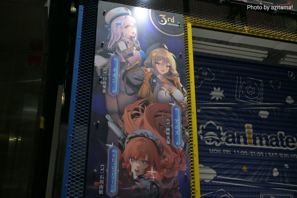 秋葉原ではアニメイトでの広告のほか、『【勝利の女神:NIKKE】 3周年記念生放送 栄光を祈る前夜祭』によると、10月27日よりJR秋葉原駅(AKIBA WARP/秋葉原エスカシートBIG、11月2日まで)、11月1日よりソフマップアミューズメント館(11月30日まで)での広告展開が予定されており、周年記念ということで広告展開に力が入っていた。