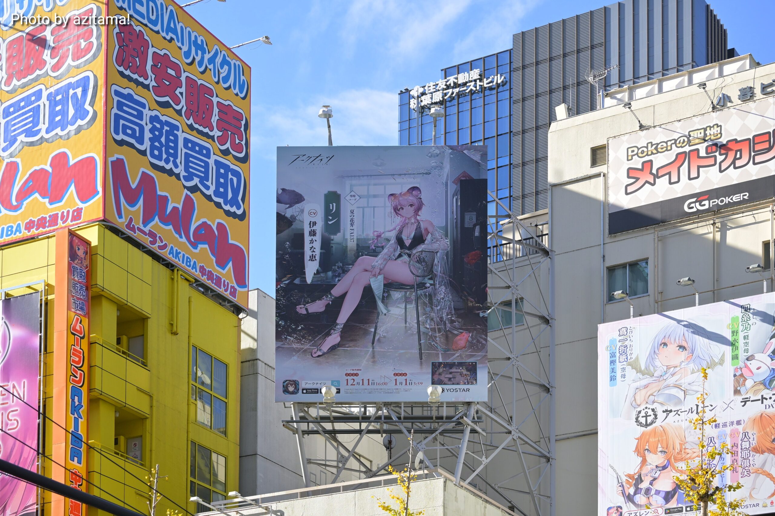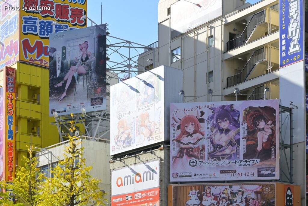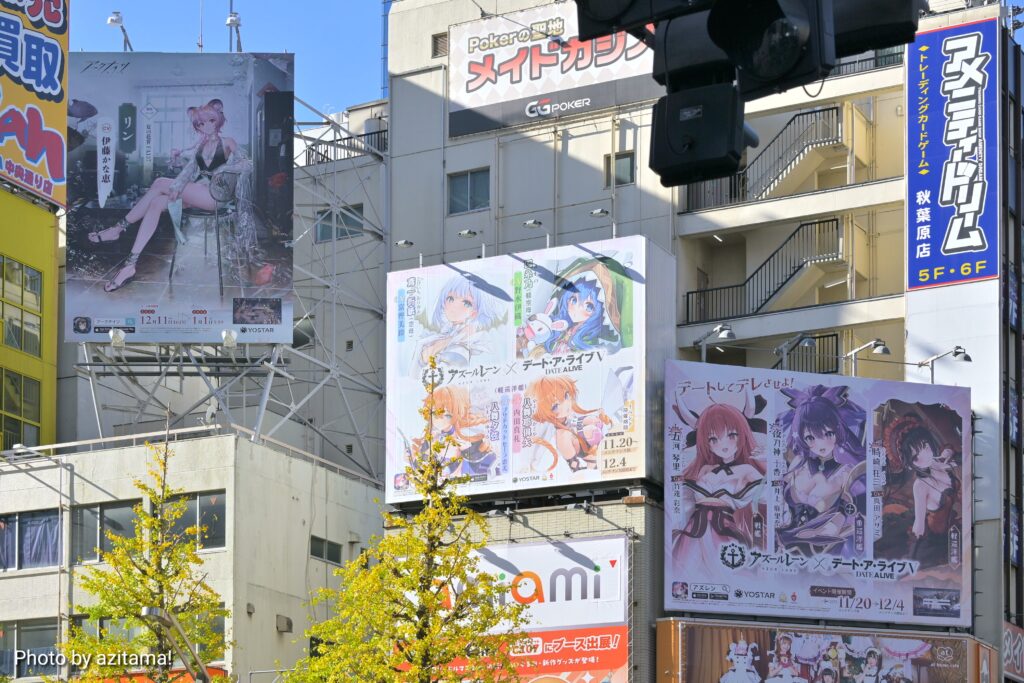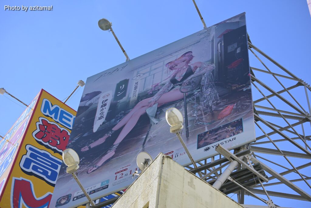 Yostarが広告主となっている秋葉原中央通りの看板、全3枠のうち左側の1枠のみ広告が掲載。投稿時点(12月13日)では、残り2枠は『アズレン』アズールレーン × デート・ア・ライブⅤ 広告が掲載され続けている。