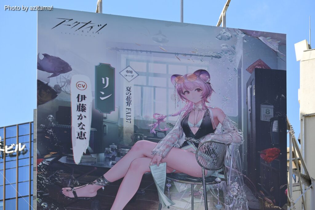 今回は『アークナイツ』リンの広告で、リンの専用コーデ『夏の花弁FA137』が販売されることを告知。秋葉原中央通りでの『アークナイツ』広告は2023年以来とかなり久しぶりの掲載となった。
