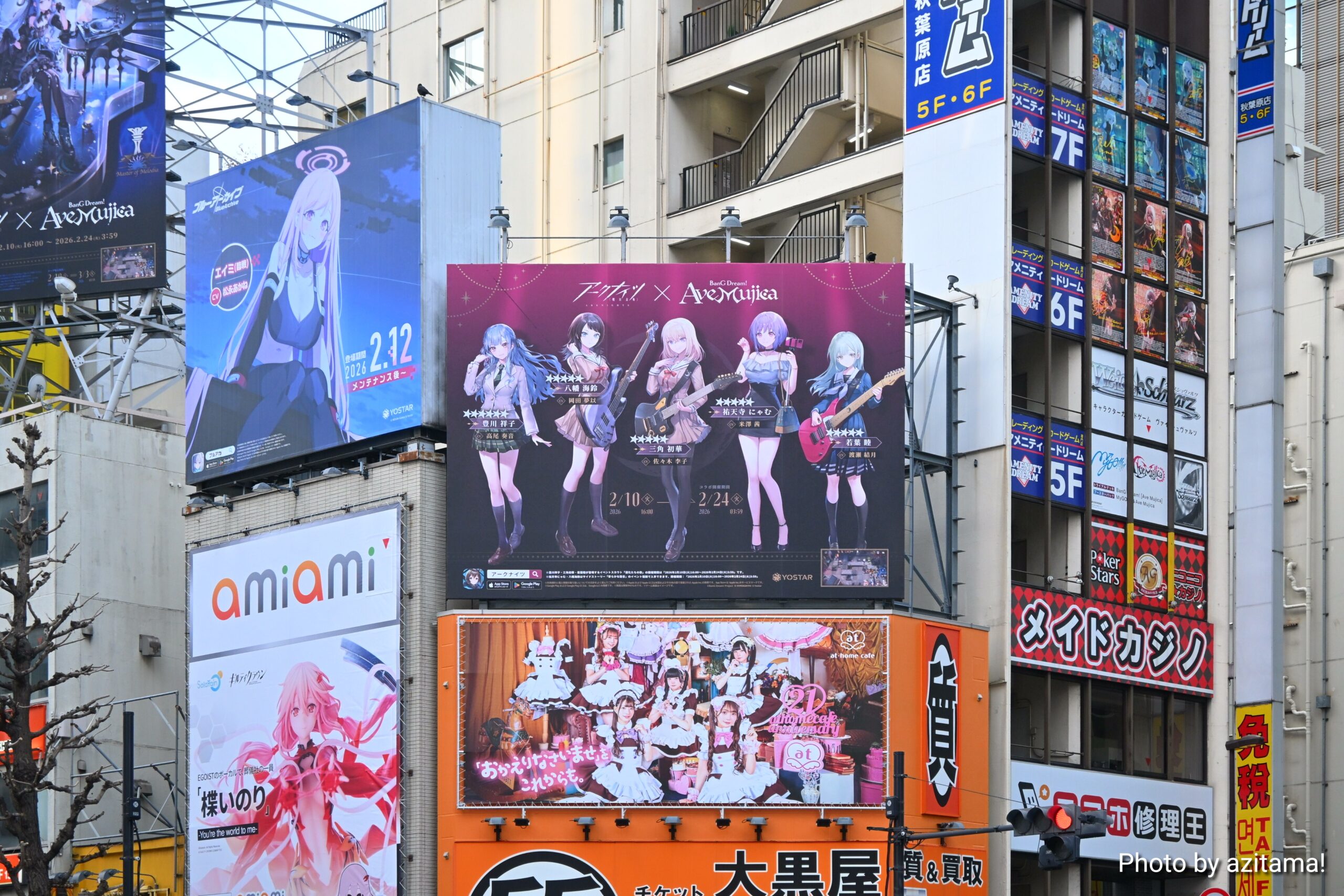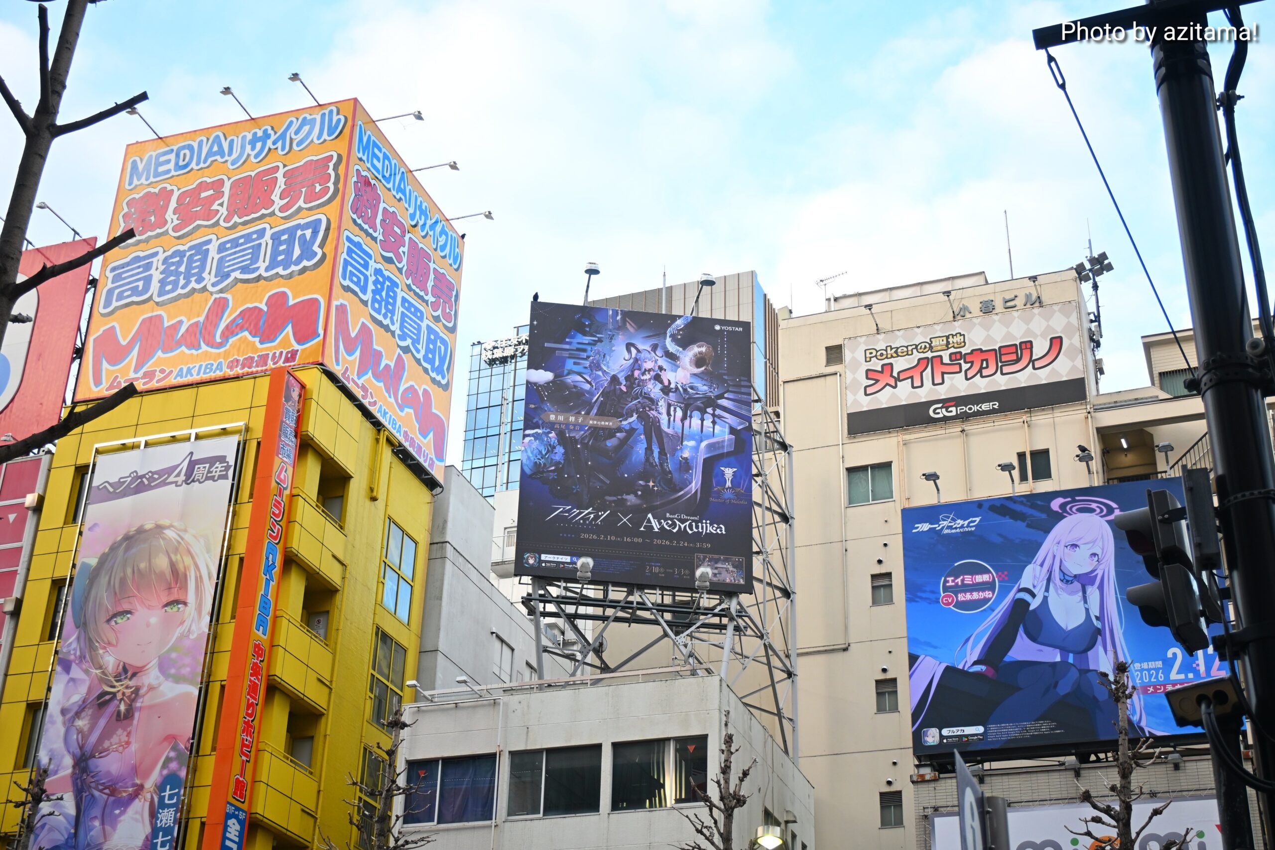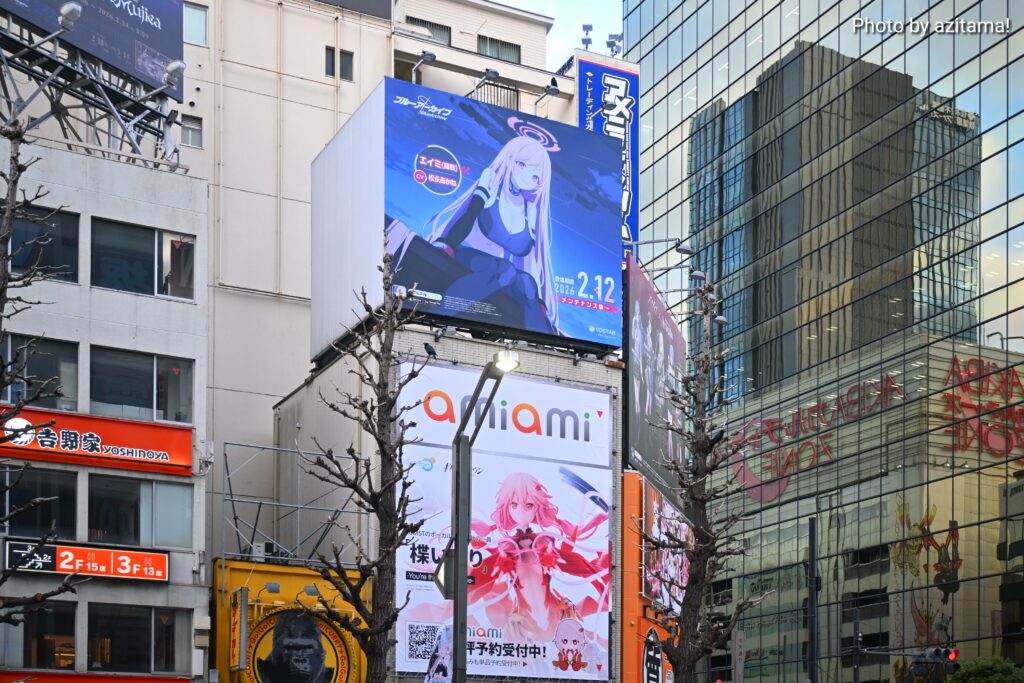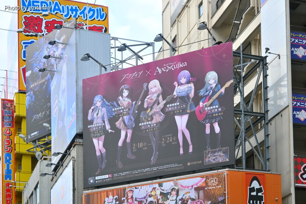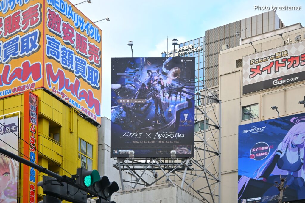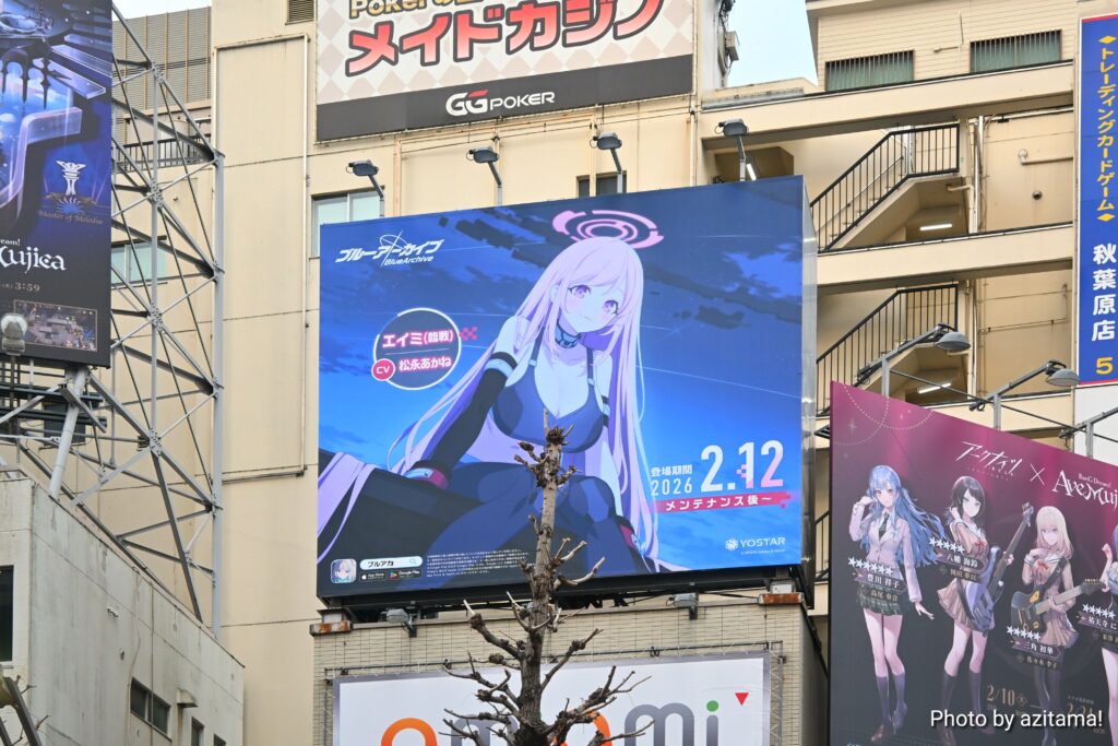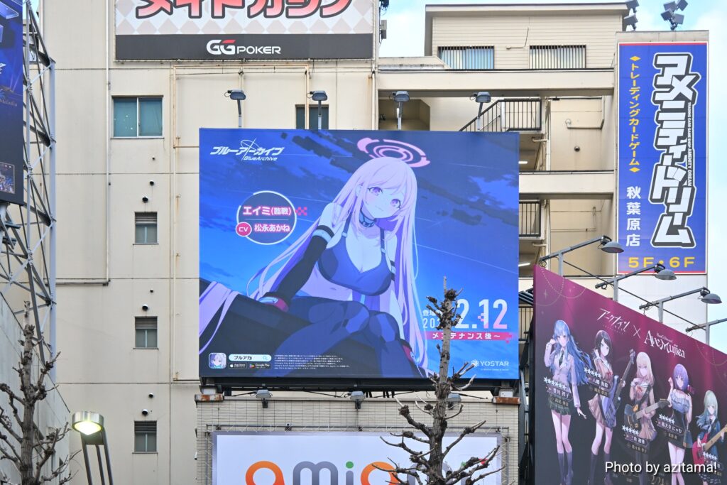 Yostarが広告主となっている秋葉原中央通りの看板、全3箇所のうち真ん中の1箇所のみ今回の『ブルアカ』広告が掲載。投稿時点(2月12日)では、前述の通り両端の2箇所にて『アークナイツ』アークナイツ ×BanG Dream! AveMujicaの広告が掲載。