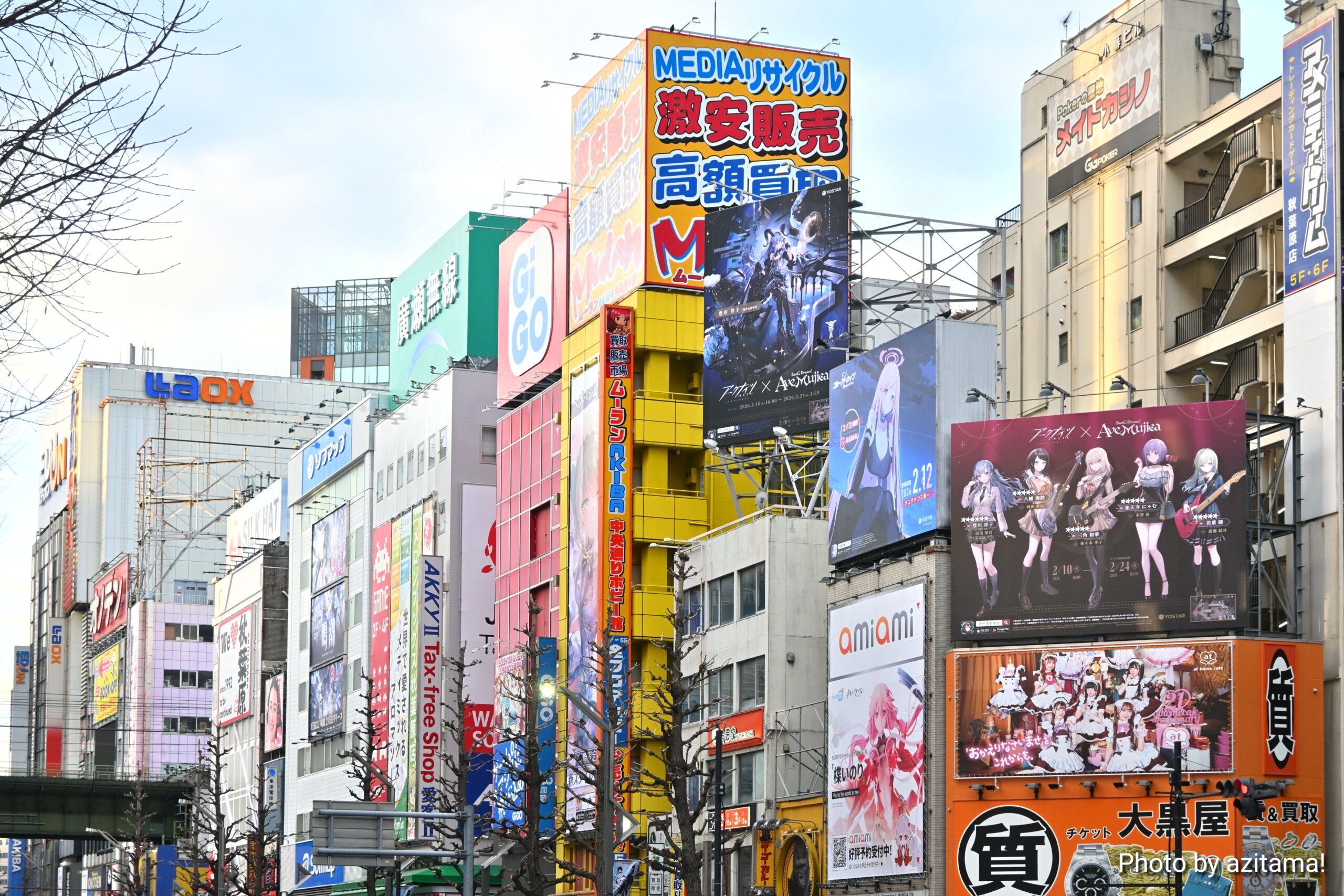 Yostarが広告主となっている秋葉原中央通りの看板、全3箇所のうち両端の2箇所のみ広告が掲載。投稿時点(2月12日)では、後述の通り真ん中の1箇所にて『ブルアカ』エイミ(臨戦)広告が掲載。