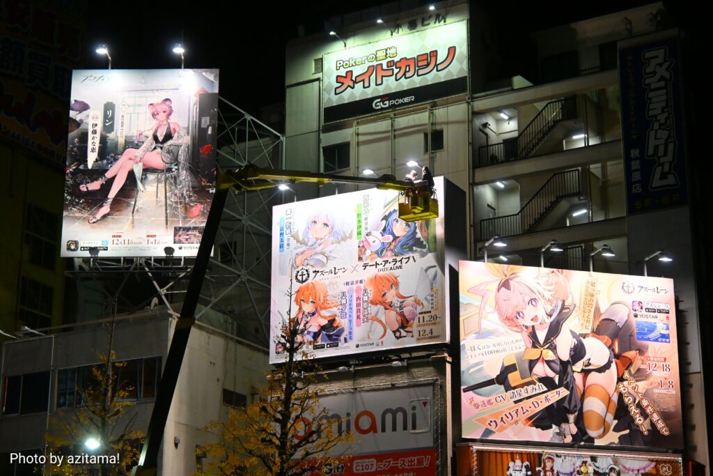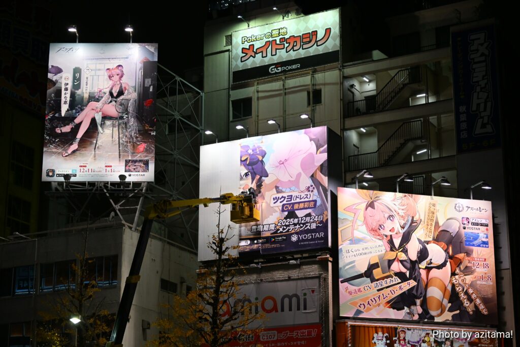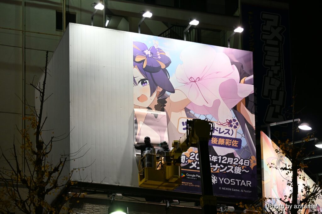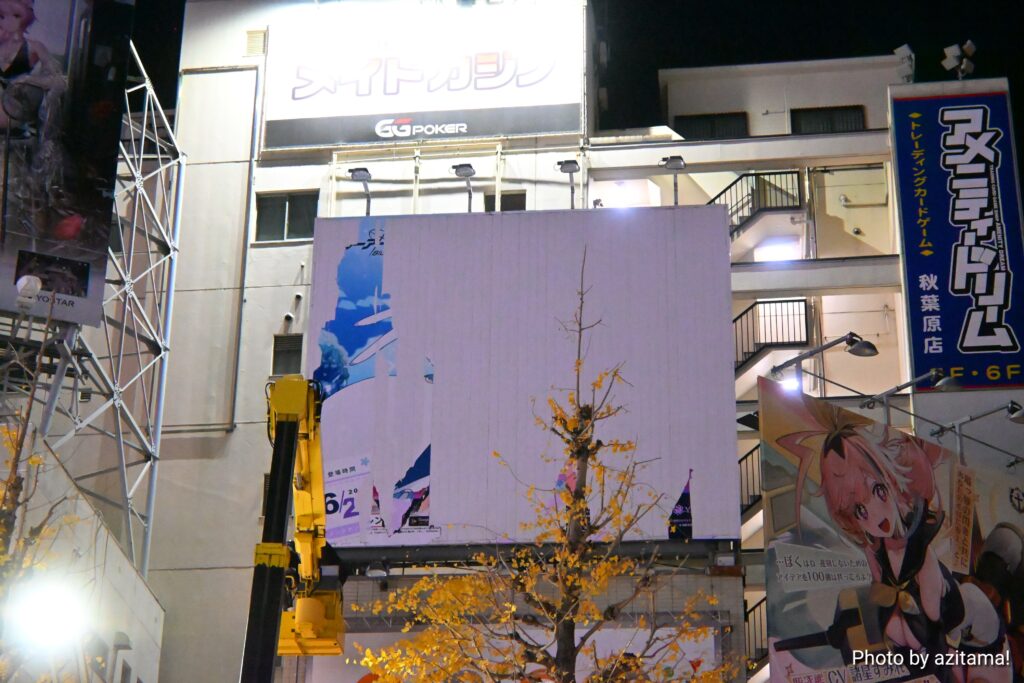 撤去作業の途中では、以前掲載されていた『ブルアカ』広告の一部が露出するレアな場面も見られた。