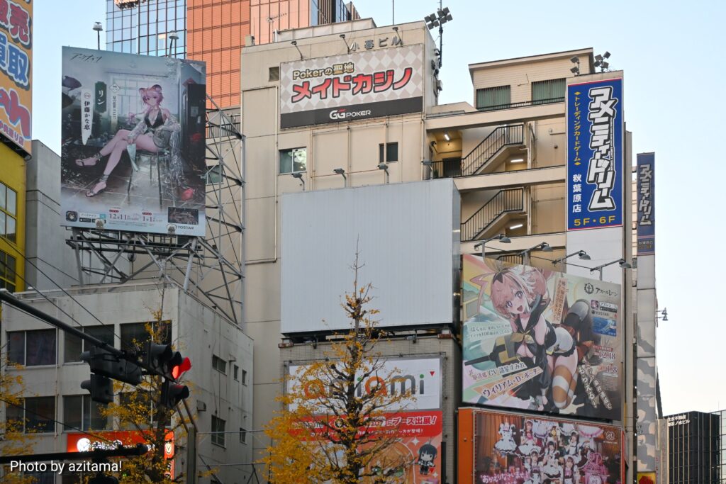 秋葉原中央通り、COMICZIN上部の広告が更新されて、ゲーム『ブルーアーカイブ -Blue Archive-』ツクヨ(ドレス)広告が掲載されている。
