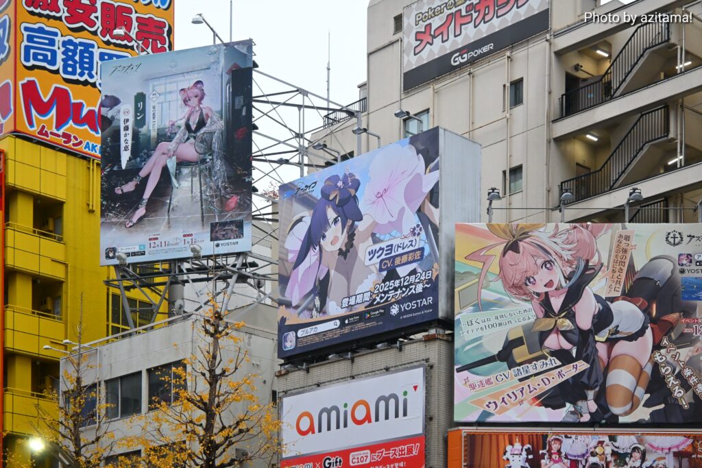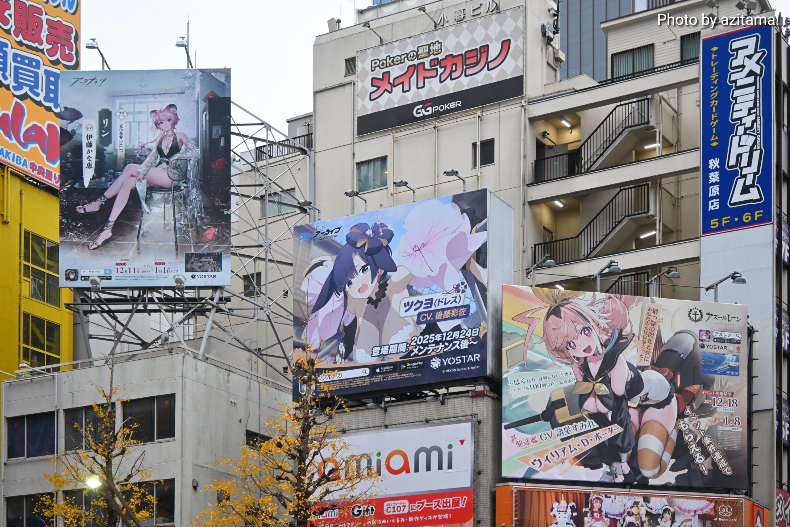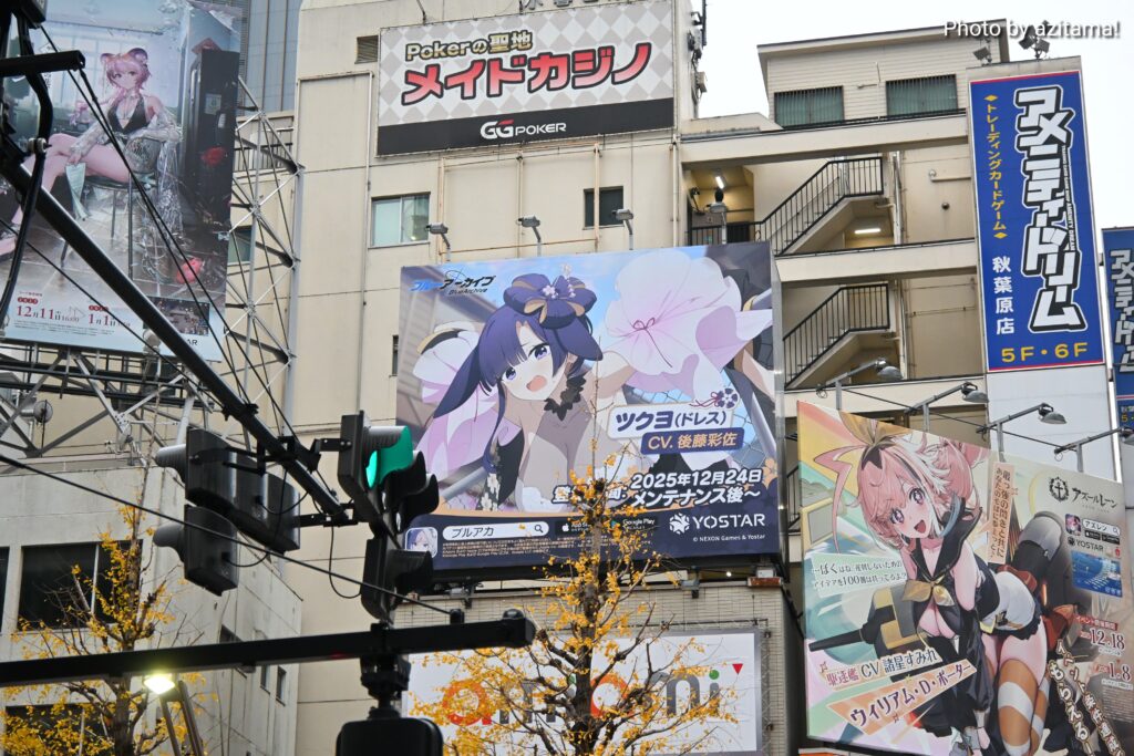 Yostarが広告主となっている秋葉原中央通りの看板、全3箇所のうち真ん中の1箇所のみ今回の『ブルアカ』広告が掲載。投稿時点(12月26日)で残り2箇所は『アークナイツ』リンの広告、『アズレン』ウィリアム・D・ポーターの広告が掲載されている。