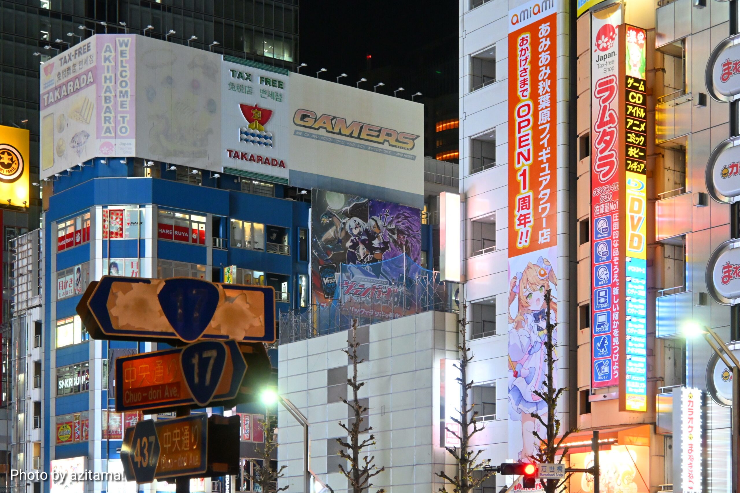 万世橋交差点付近から撮影。ゲーマーズ本店に近接する建物の解体工事が進んだことで、遠くからも広告が見えるようになった。