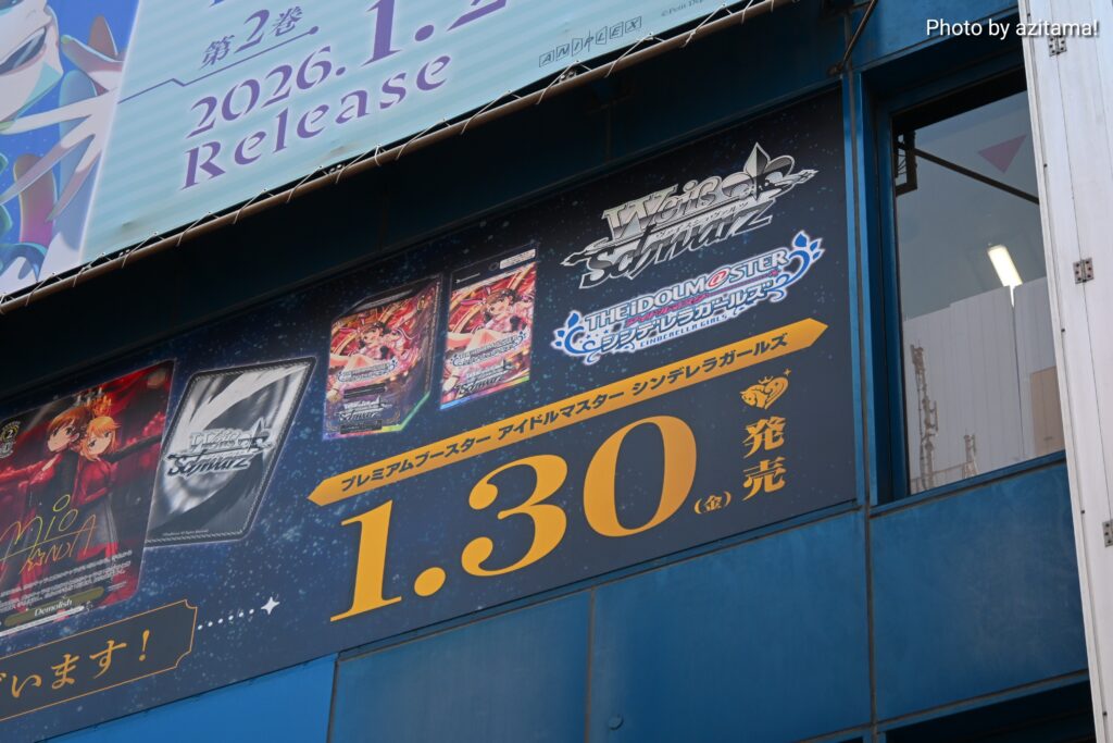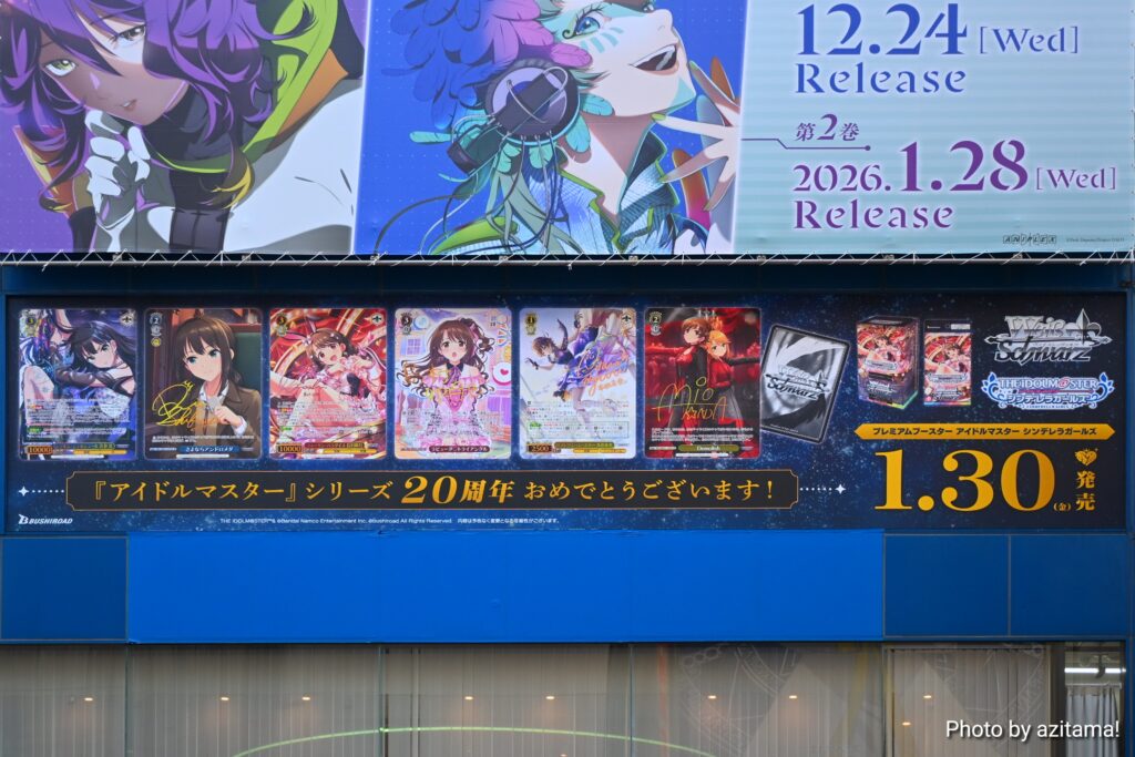 今回はヴァイスシュヴァルツ『アイドルマスター シンデレラガールズ』で、プレミアムブースターが1月30日に発売予定。広告下部では「『アイドルマスター』シリーズ 20周年おめでとうございます!」の文字も。