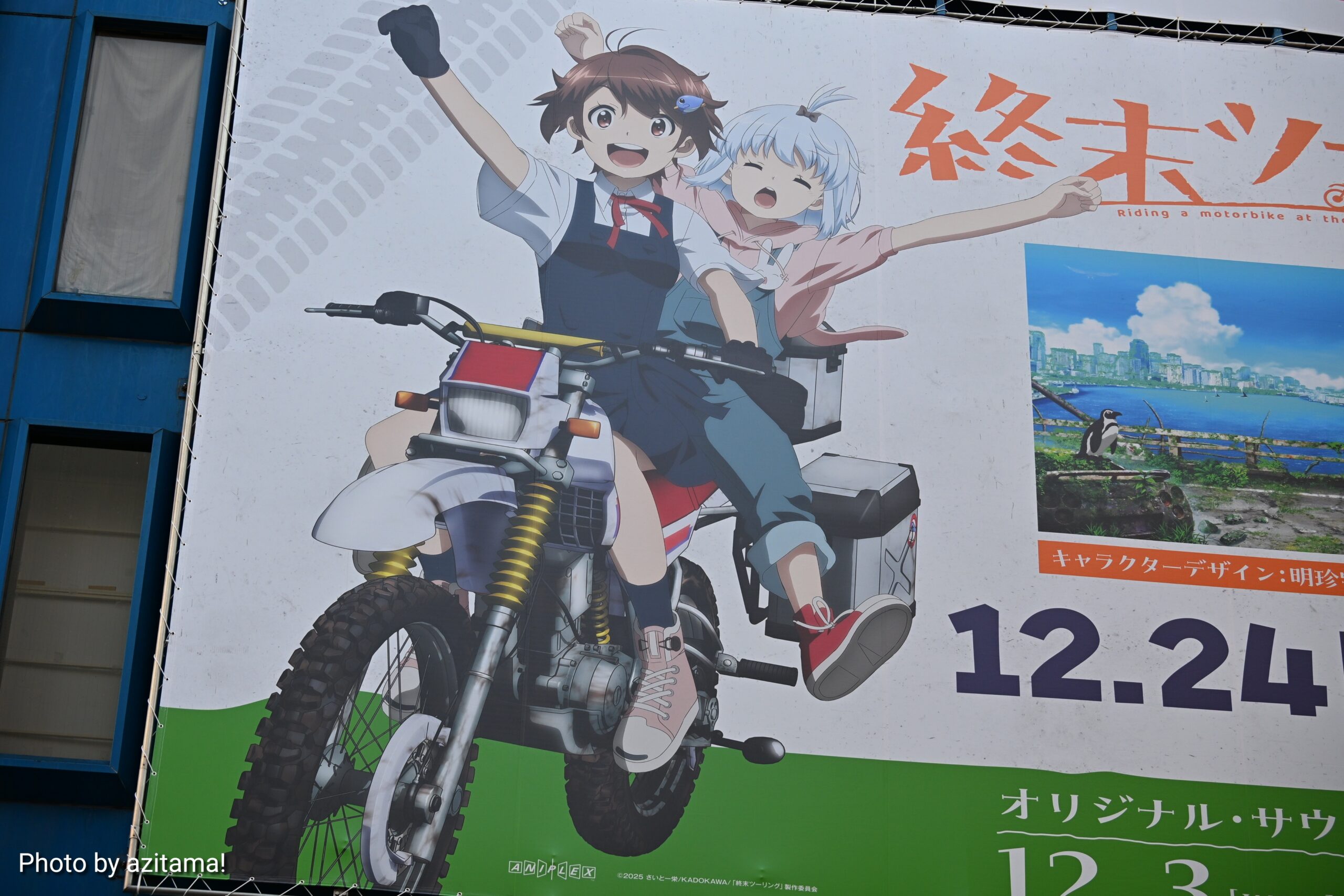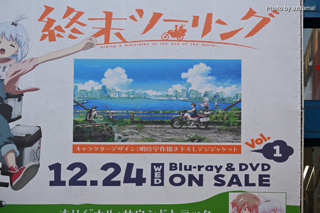 今回の広告はTVアニメ『終末ツーリング』で、2025年10月よりTVアニメが放送されており、作中では第4話に秋葉原が登場。広告では作品の主要キャラクター、ヨーコ、アイリの2人が登場。またBlu-ray&DVDのVol.1/オリジナル・サウンドトラックの発売を告知。