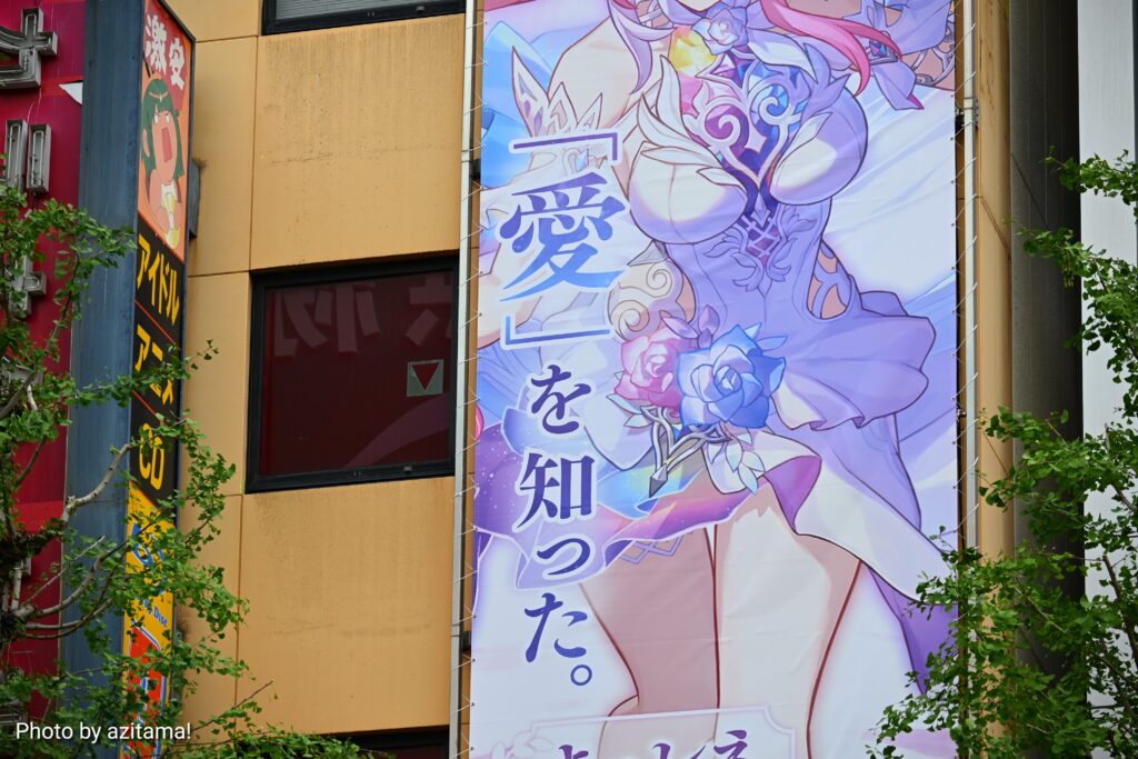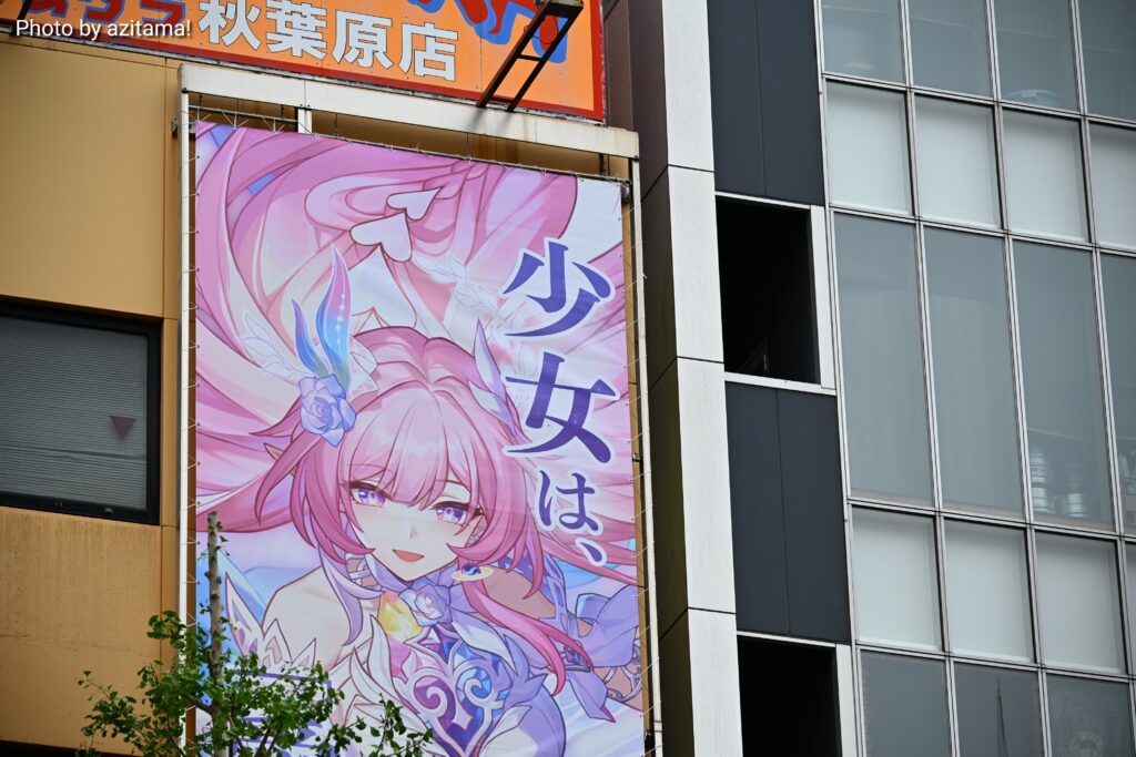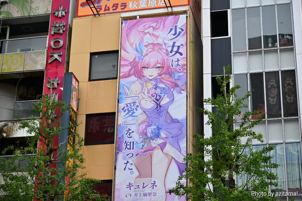 今回はゲーム『崩壊:スターレイル』キュレネの広告で、「少女は、「愛」を知った。」の文字と共にキュレネの姿が大きく登場。秋葉原での『スターレイル』広告は今年の4月以来とかなり久しぶりの新規広告となった。