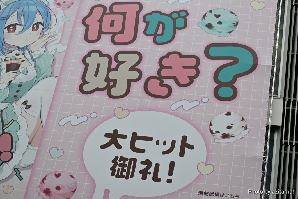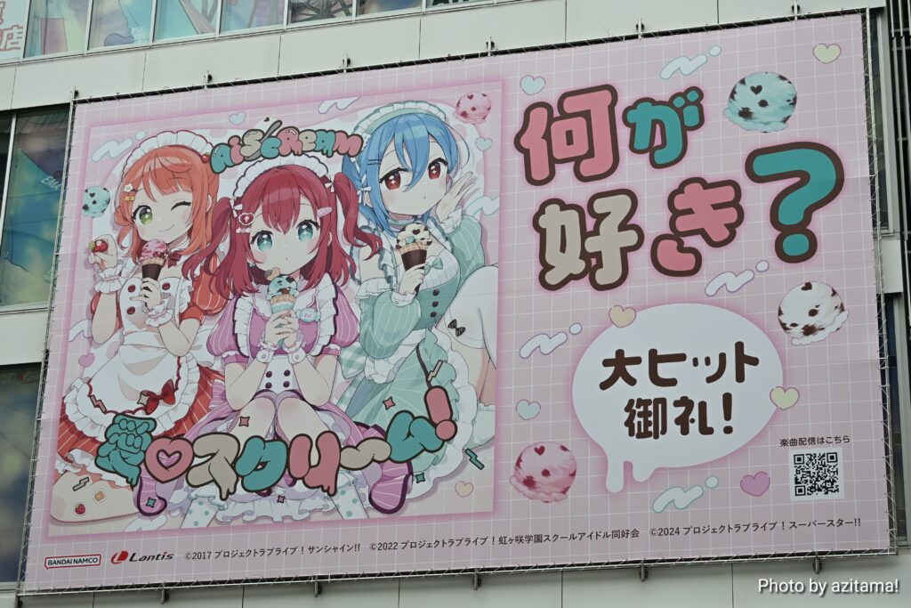 今回はAiScReam デビューシングル『愛♡スクリ〜ム!』に関連する広告で、秋葉原では初の広告掲載。広告右側には『愛♡スクリ~ム!』歌詞内の特徴的なフレーズ「何が好き?」 と共に「大ヒット御礼!」の文字も。