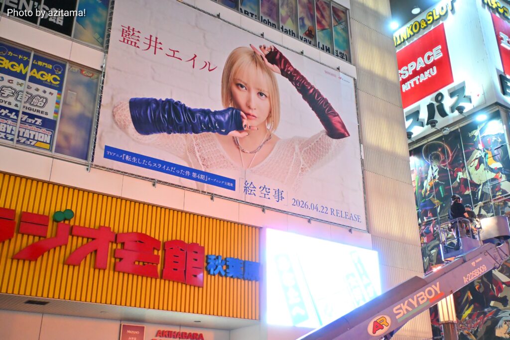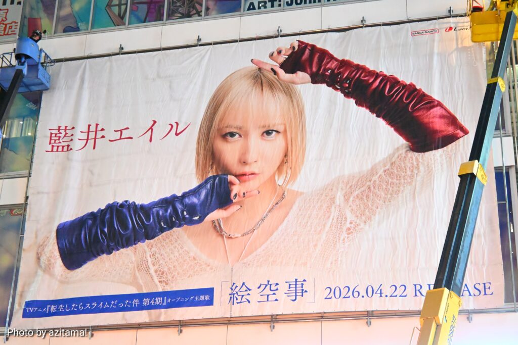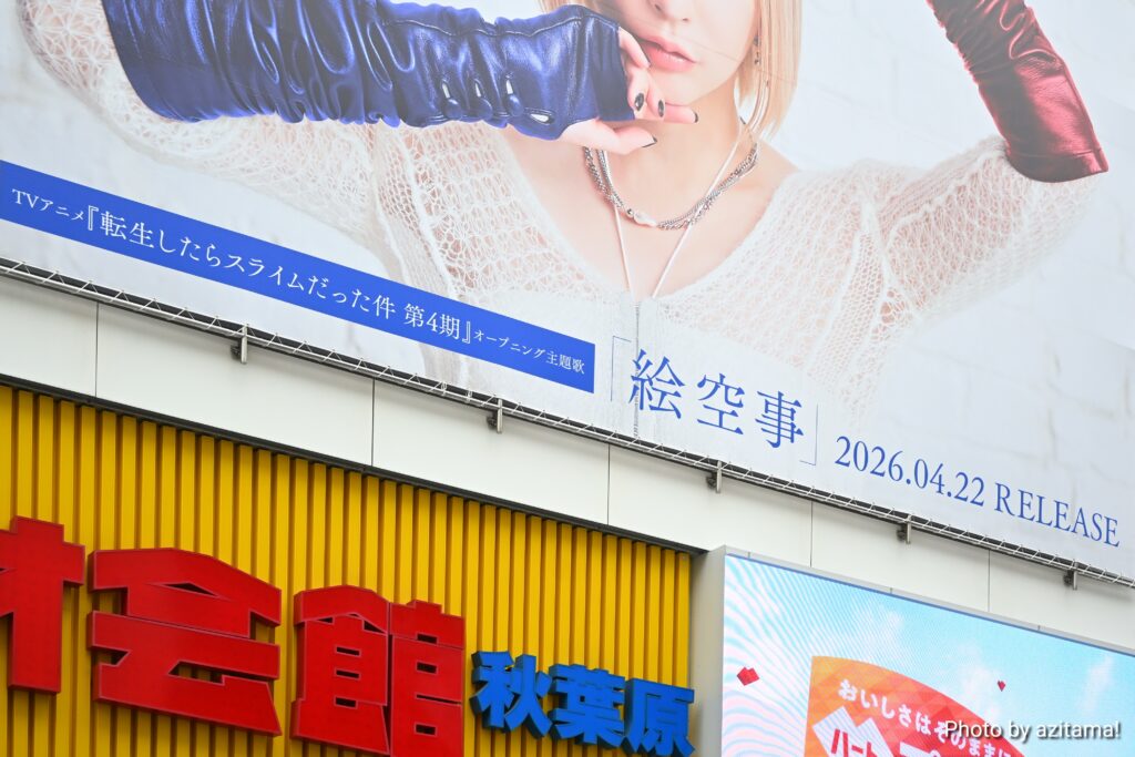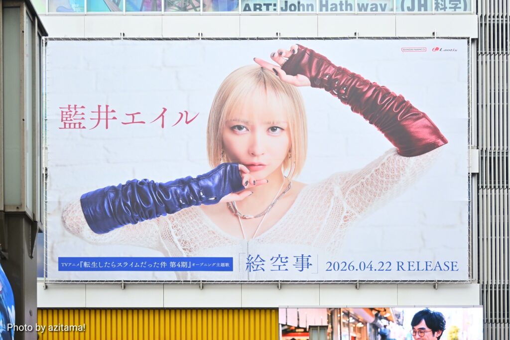 今回の広告は藍井エイル『絵空事』の広告で、TVアニメ『転生したらスライムだった件 第4期』オープニング主題歌となっている『絵空事』のリリースを告知。前回の『MONSTER』広告に続き、2か月連続で藍井エイルさんが登場した。