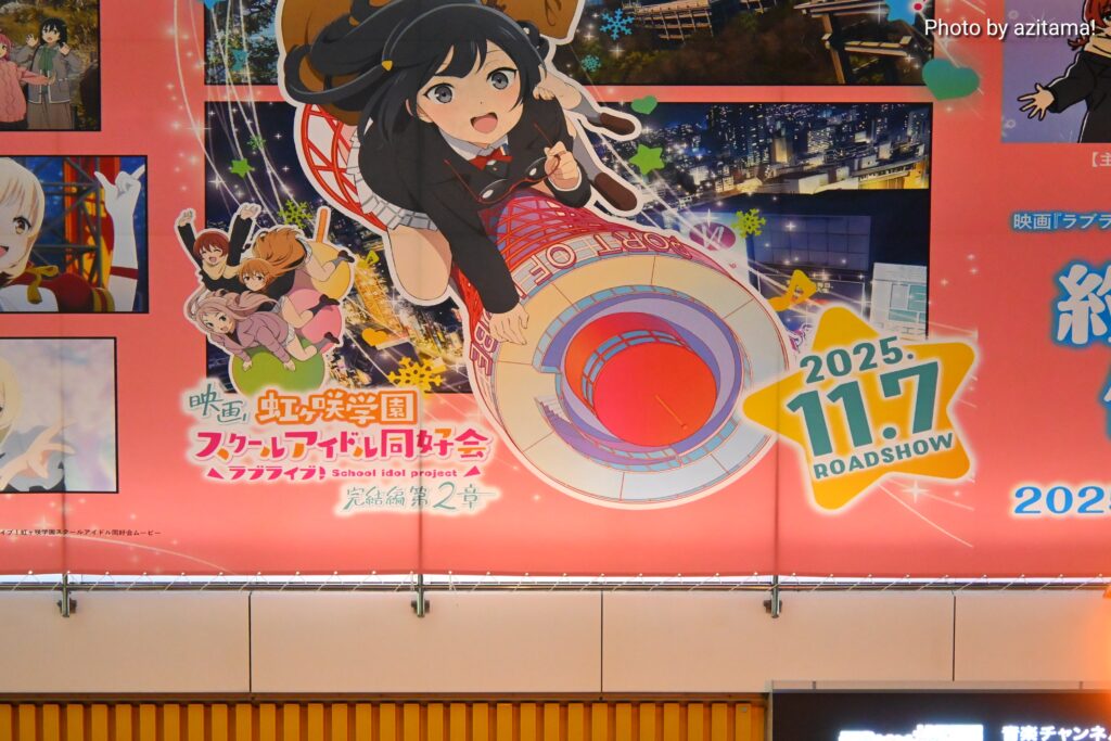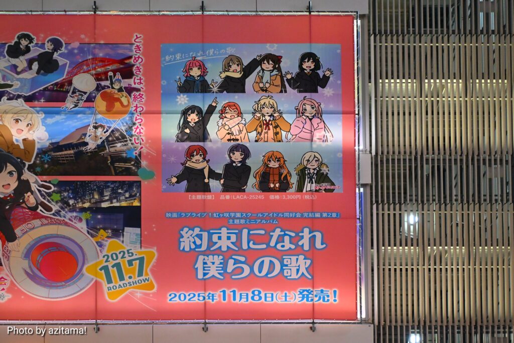 今回は映画『ラブライブ!虹ヶ咲学園スクールアイドル同好会 完結編 第2章』の広告で、2025年11月7日に公開が予定されている映画作品。キャッチコピーは「ときめきは、終わらない。」広告右側では『完結編 第2章』主題歌ミニアルバム『約束になれ僕らの歌』の発売も告知。
