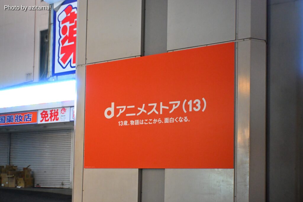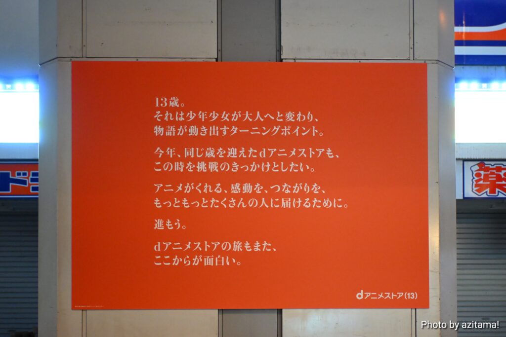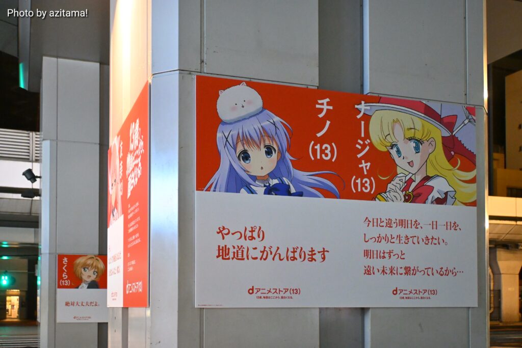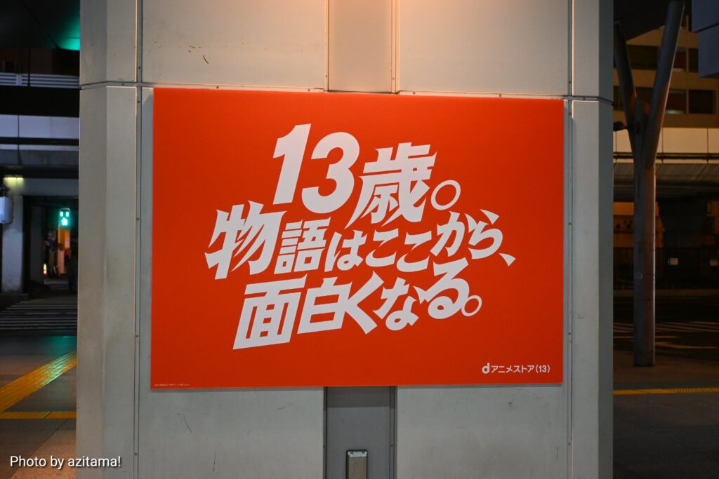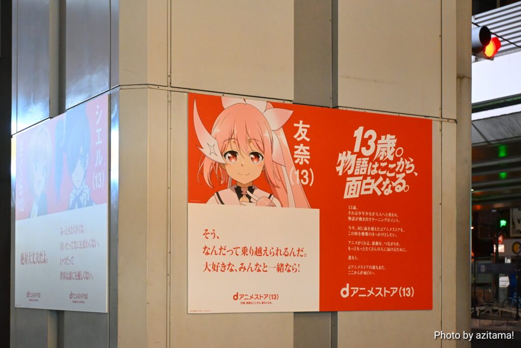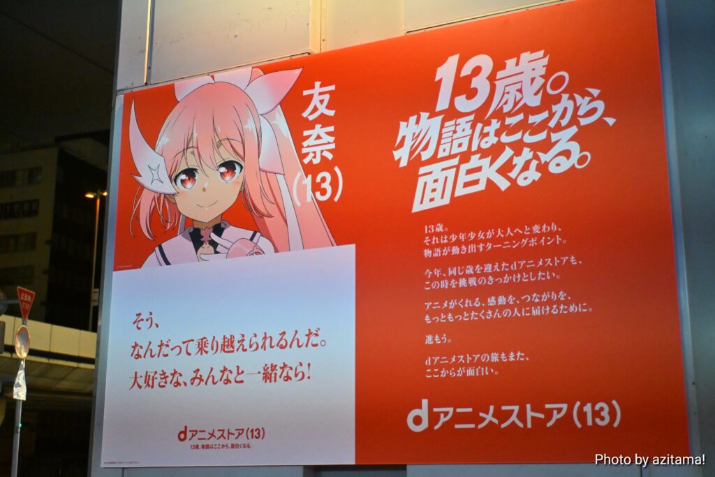 『dアニメストア』がサービス開始から13周年を迎えたことを記念した広告となっており、「dアニメストア(13)」という文字に加え、「ナルト(13)」「あかり(13)」「チノ(13)」「友奈(13)」など、「13歳」のキャラクター(アニメ時点)が秋葉原駅前に多数登場。