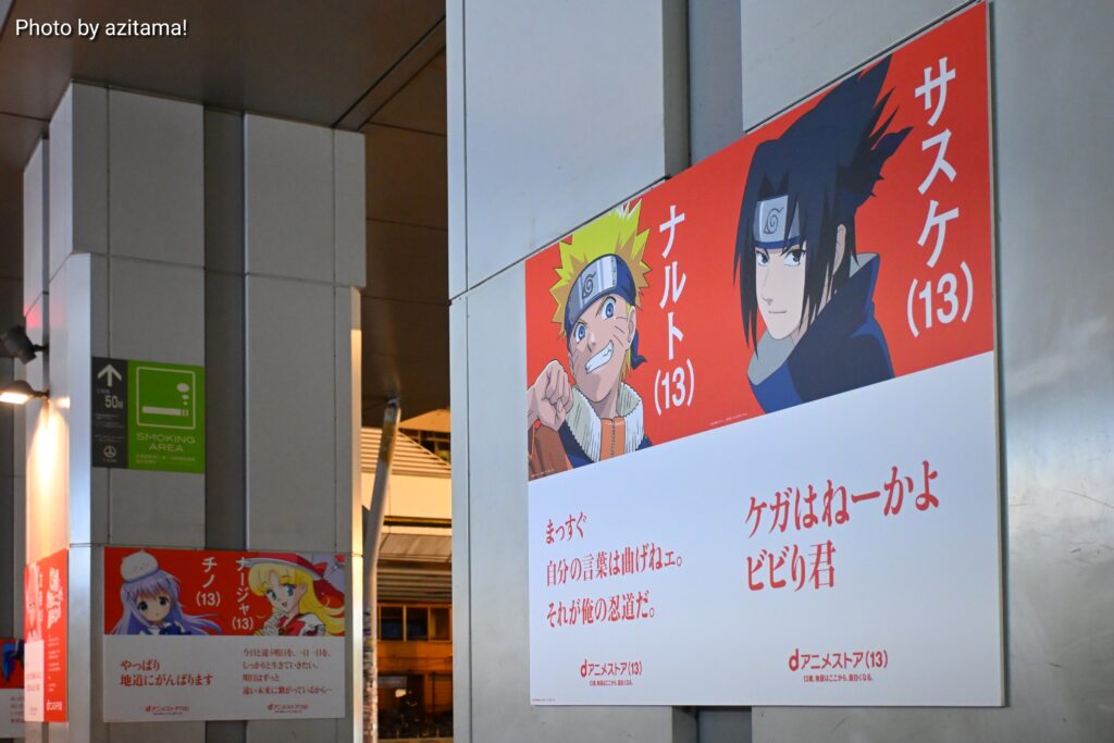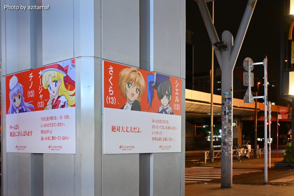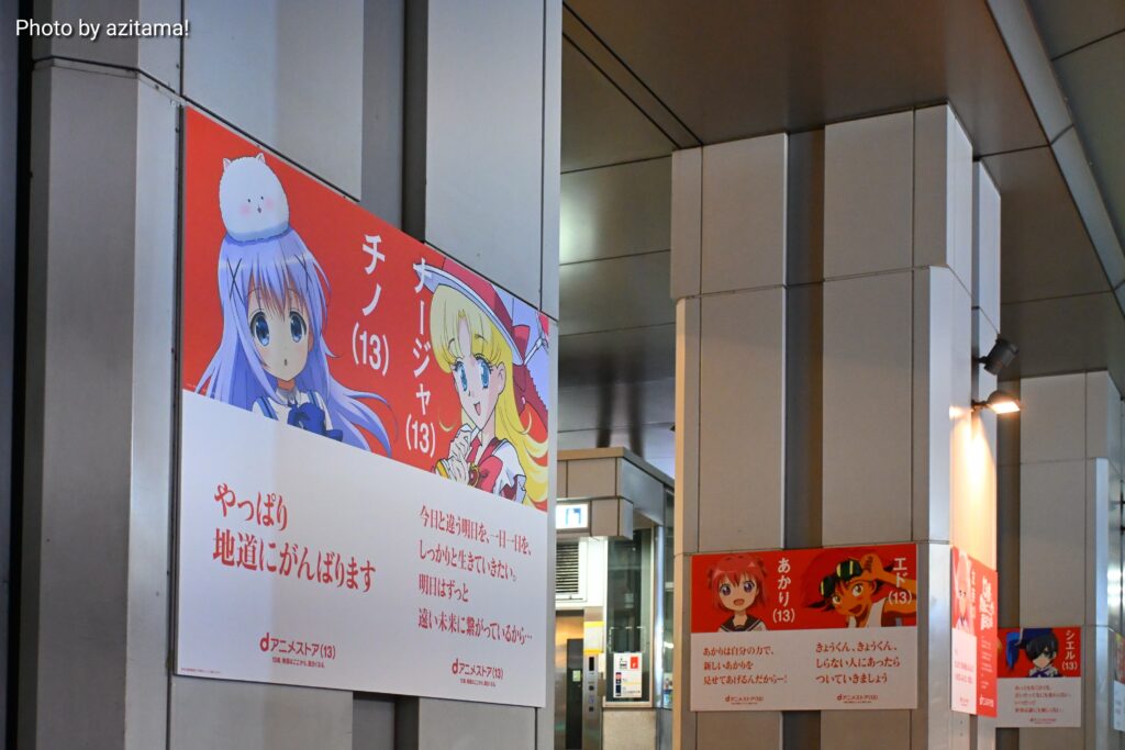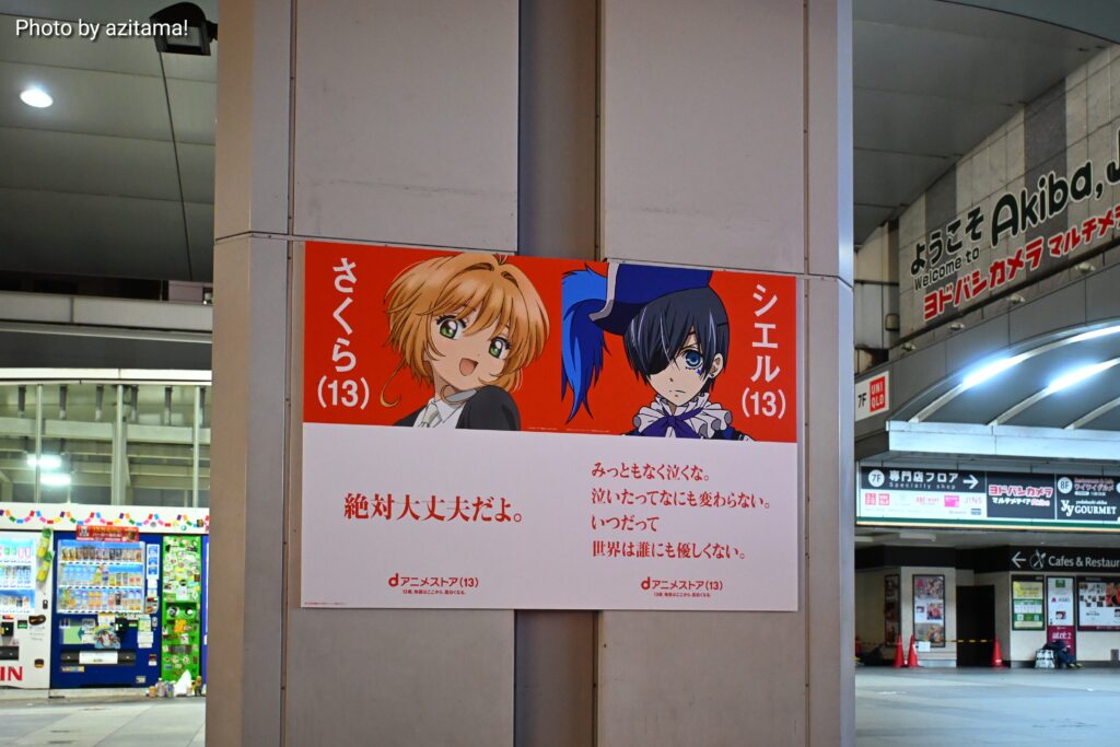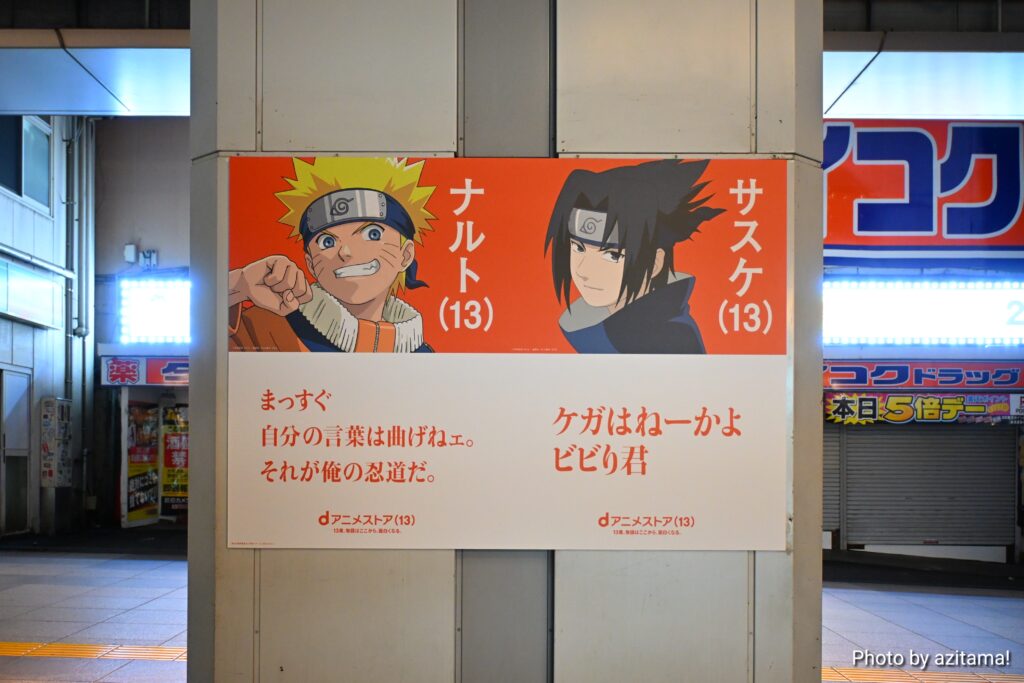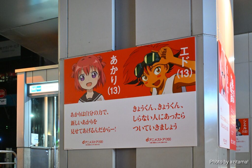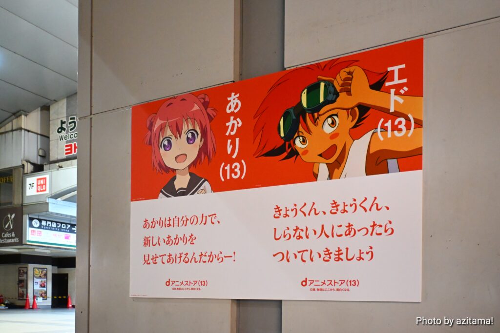 『dアニメストア』がサービス開始から13周年を迎えたことを記念した広告となっており、「dアニメストア(13)」という文字に加え、「ナルト(13)」「あかり(13)」「チノ(13)」「友奈(13)」など、「13歳」のキャラクター(アニメ時点)が秋葉原駅前に多数登場。