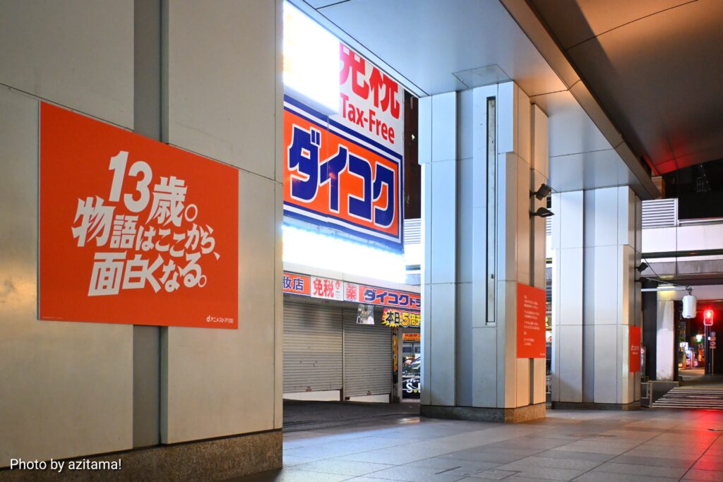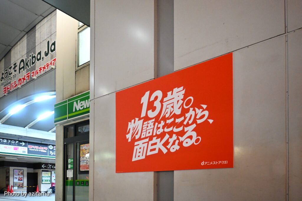 JR秋葉原駅 昭和通り口正面の通路に『dアニメストア』13歳。物語はここから、面白くなる。広告が掲載されている。